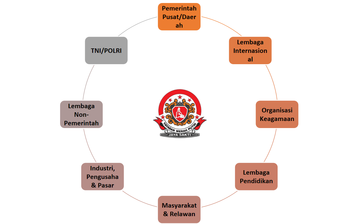 YAYASAN MERAH PUTIH JAYA SAKTI akan senantiasan menjaga jaringan dan kemitraan dengan semua shareholder maupun stakeholder dalam melakukan seluruh kegiatannya, khususnya dengan Pemerintahan Republik Indonesia dari tingkat bawah hingga pusat, TNI/POLRI, lembaga non-pemerintah, lembaga internasional, organisasi keagamaan, lembaga pendidikan, Industri, pengusaha & pasar, masyarakat & relawan.